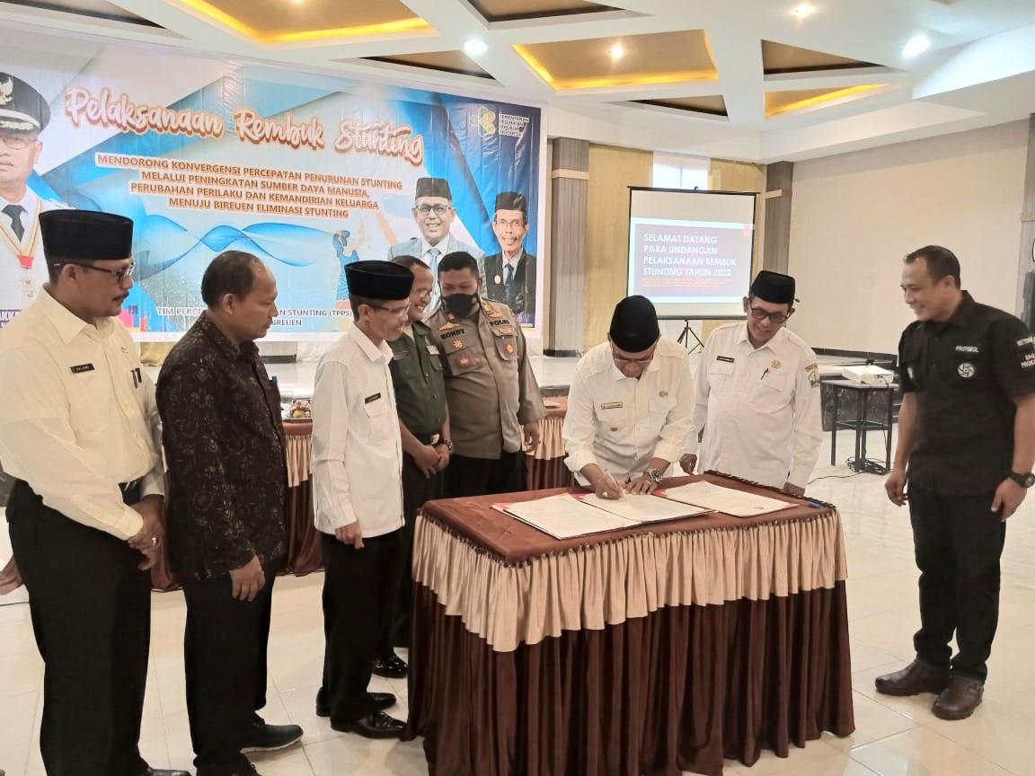 Bireuen - Pemerintah Kabupaten Bireuen mengadakan pertemuan pelaksanaan rembuk stunting, berlangsung di Aula Fajar Hotel, Rabu, 18 Mei 2022. Kegiatan tersebut dibuka oleh Bupati Bireuen, Muzakkar A.Gani, dalam sambutannya menyampaikan, Intervensi penanganan stunting di Kabupaten Bireuen sudah dilaksanakan mulai tahun 2020 dan tahun 2022 merupakan tahun ketiga pelaksanaan intervensi penurunan stunting. Pelaksanaan rembuk stunting tahun 2022 mengangkat tema, mendorong konvergensi percepatan penurunan stunting melalui peningkatan sumber daya manusia, perubahan perilaku dan kemandirian keluarga menuju Bireuen eliminasi stunting, jelas bupati Katanya, kegiatan ini bertujuan untuk menyampaikan hasil analisis situasi dan rancangan rencana kegiatan intervensi penurunan stunting kabupaten terintegrasi. “Dari pelaksanaan rembuk stunting output yang diharapkan adalah Mendeklarasikan komitmen Tim Percepatan Penurunan Stunting (TPPS),” harap Muzakkar